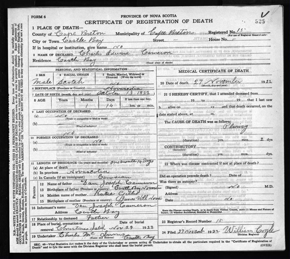 Death Registration: Year: 1922 file: 76 number: 525