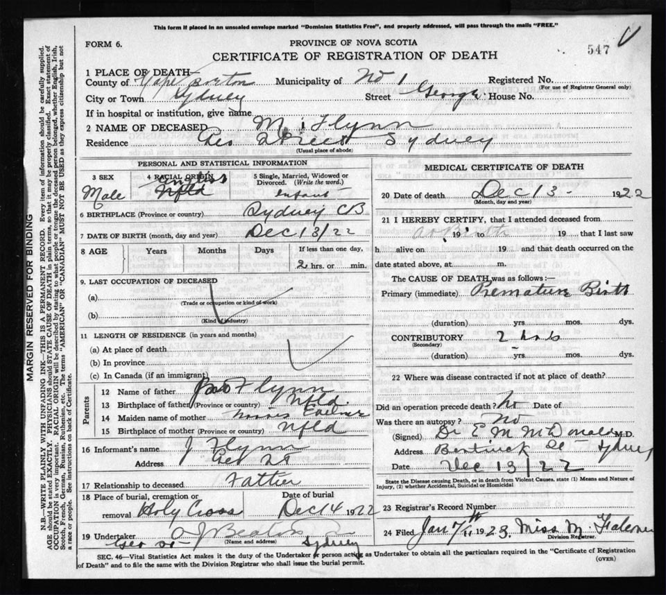 Death Registration: Year: 1922 file: 76 number: 547