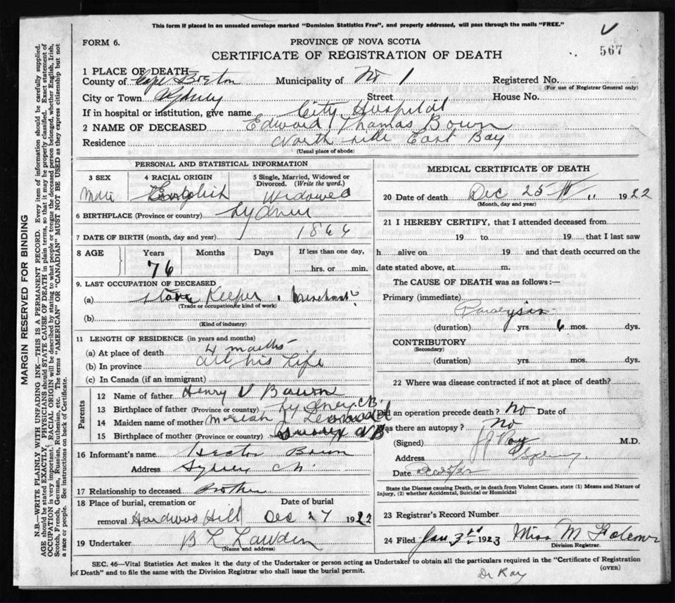 Death Registration: Year: 1922 file: 76 number: 567