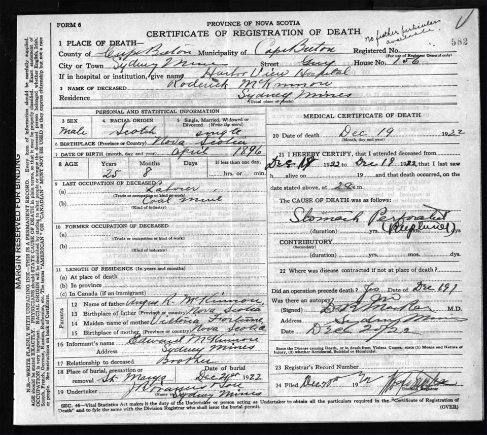 Death Registration: Year: 1922 file: 76 number: 582
