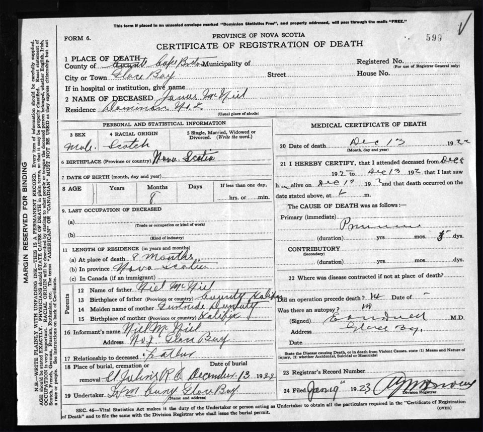 Death Registration: Year: 1922 file: 76 number: 599