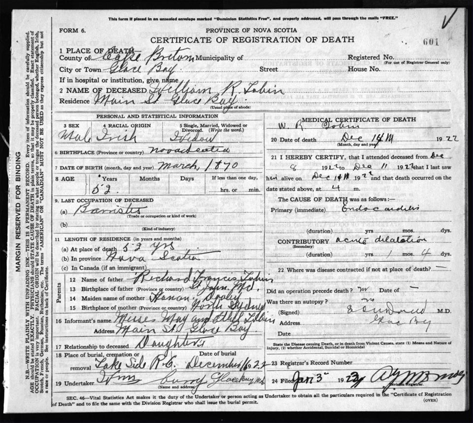 Death Registration: Year: 1922 file: 76 number: 601