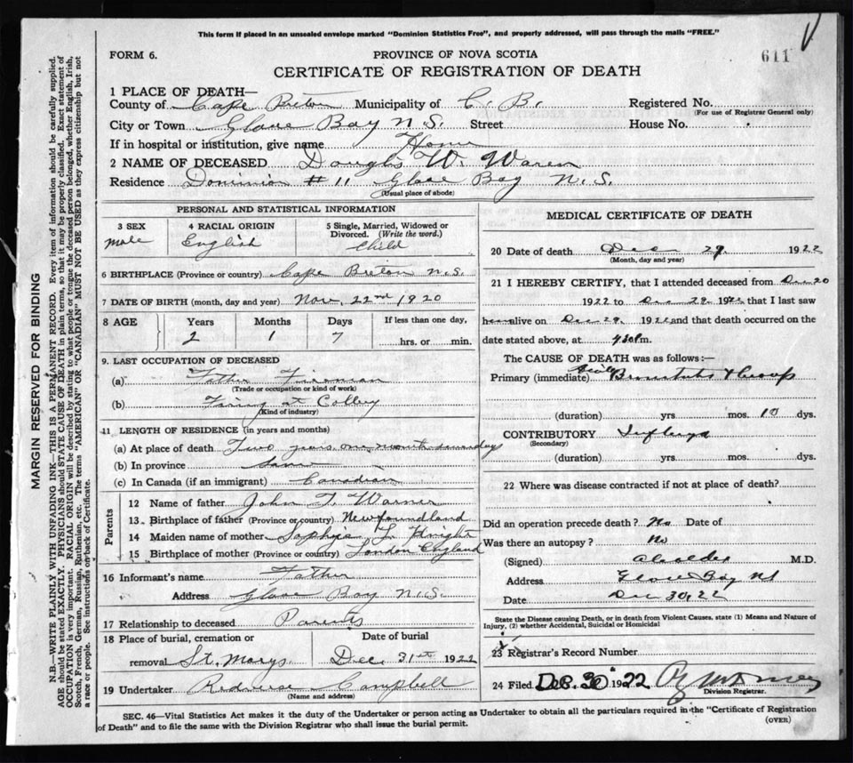 Death Registration: Year: 1922 file: 76 number: 611