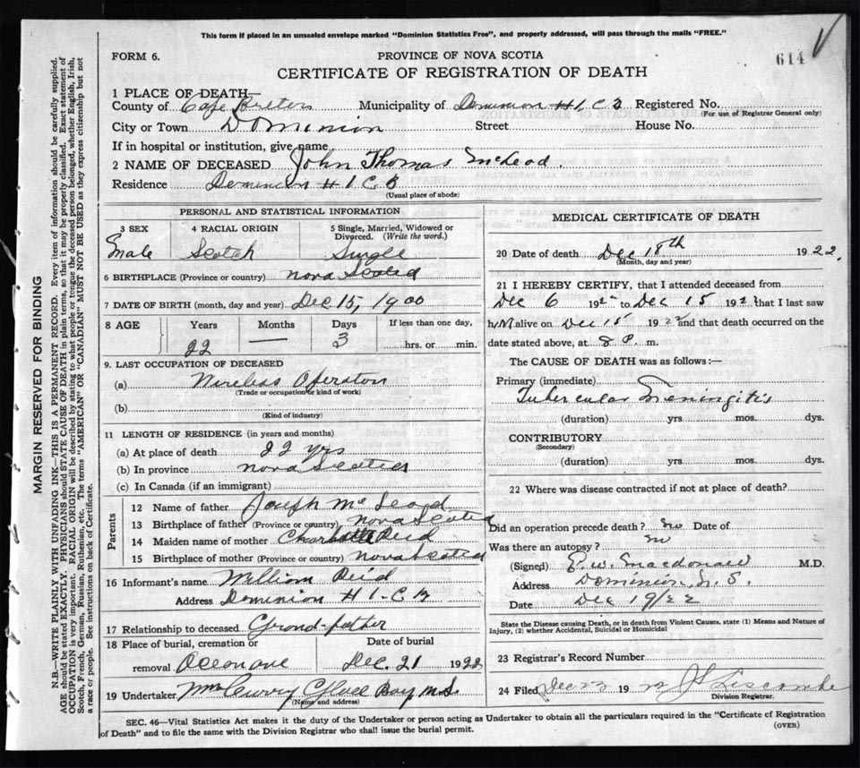 Death Registration: Year: 1922 file: 76 number: 614