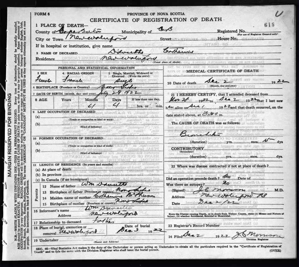 Death Registration: Year: 1922 file: 76 number: 616