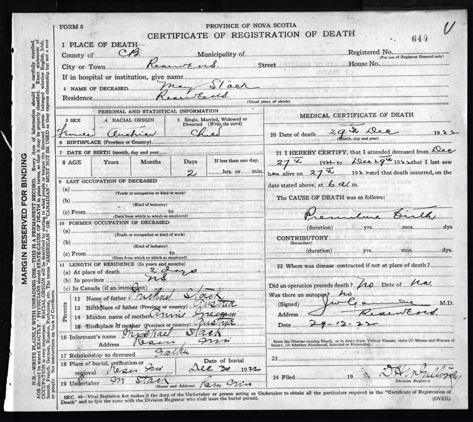Death Registration: Year: 1922 file: 76 number: 649
