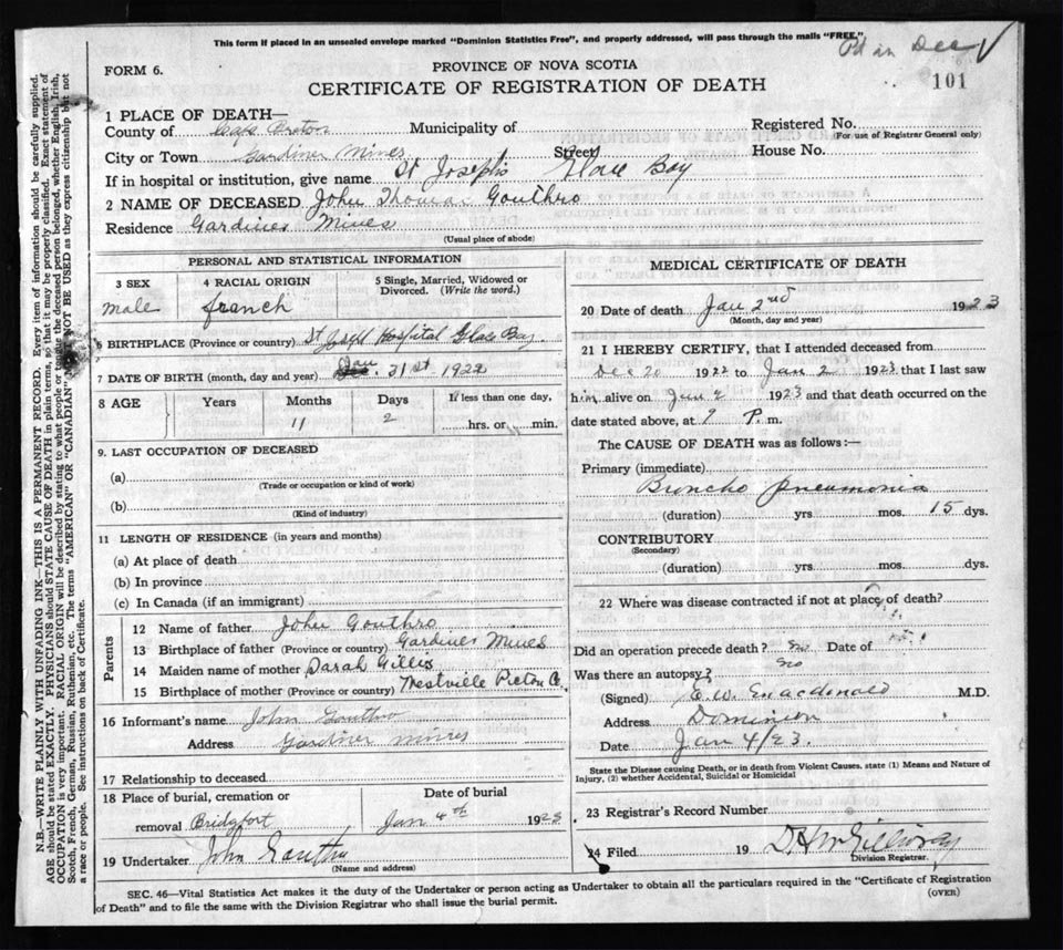 Death Registration: Year: 1923 file: 77 number: 101