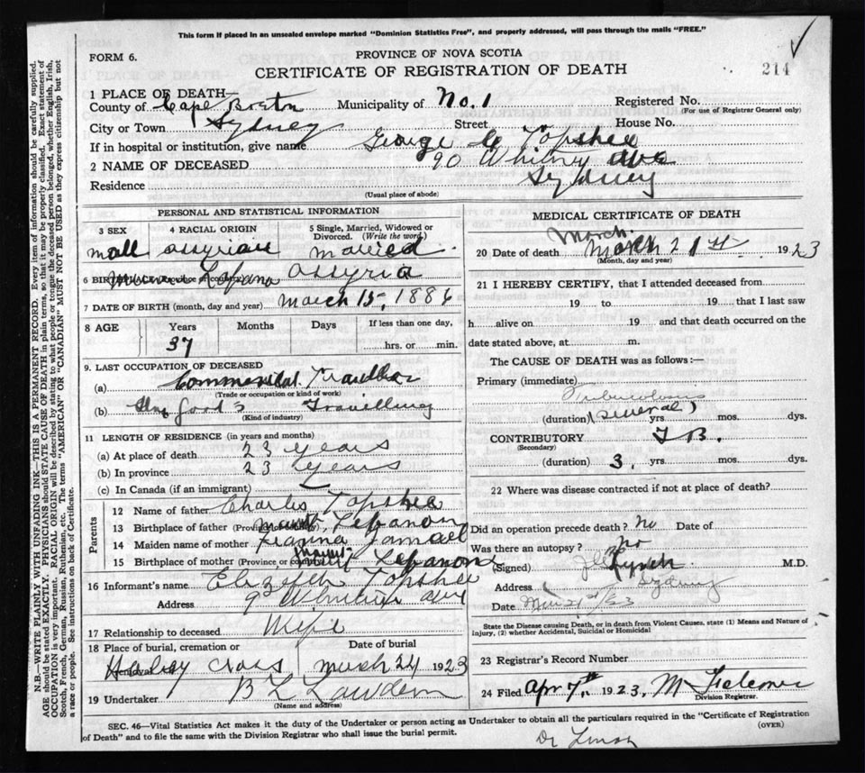 Death Registration: Year: 1923 file: 77 number: 214