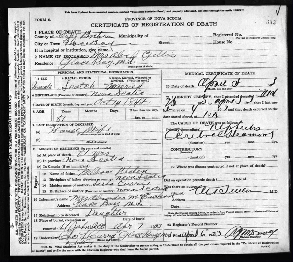 Death Registration: Year: 1923 file: 77 number: 353