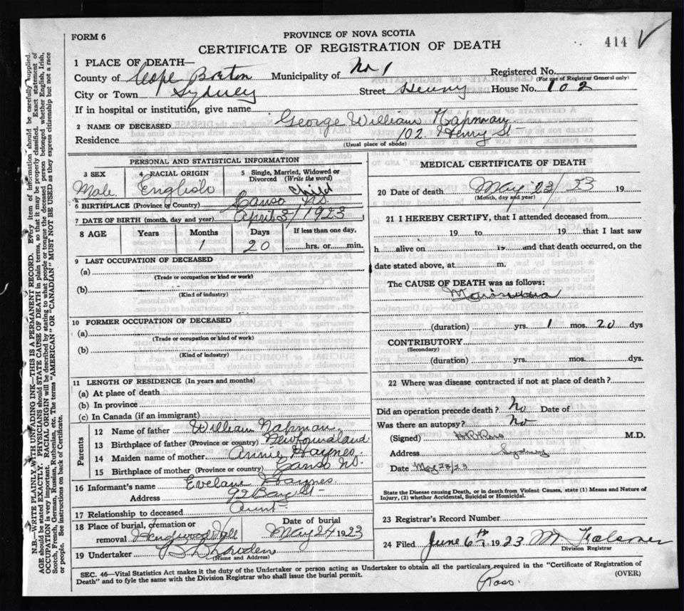 Death Registration: Year: 1923 file: 77 number: 414