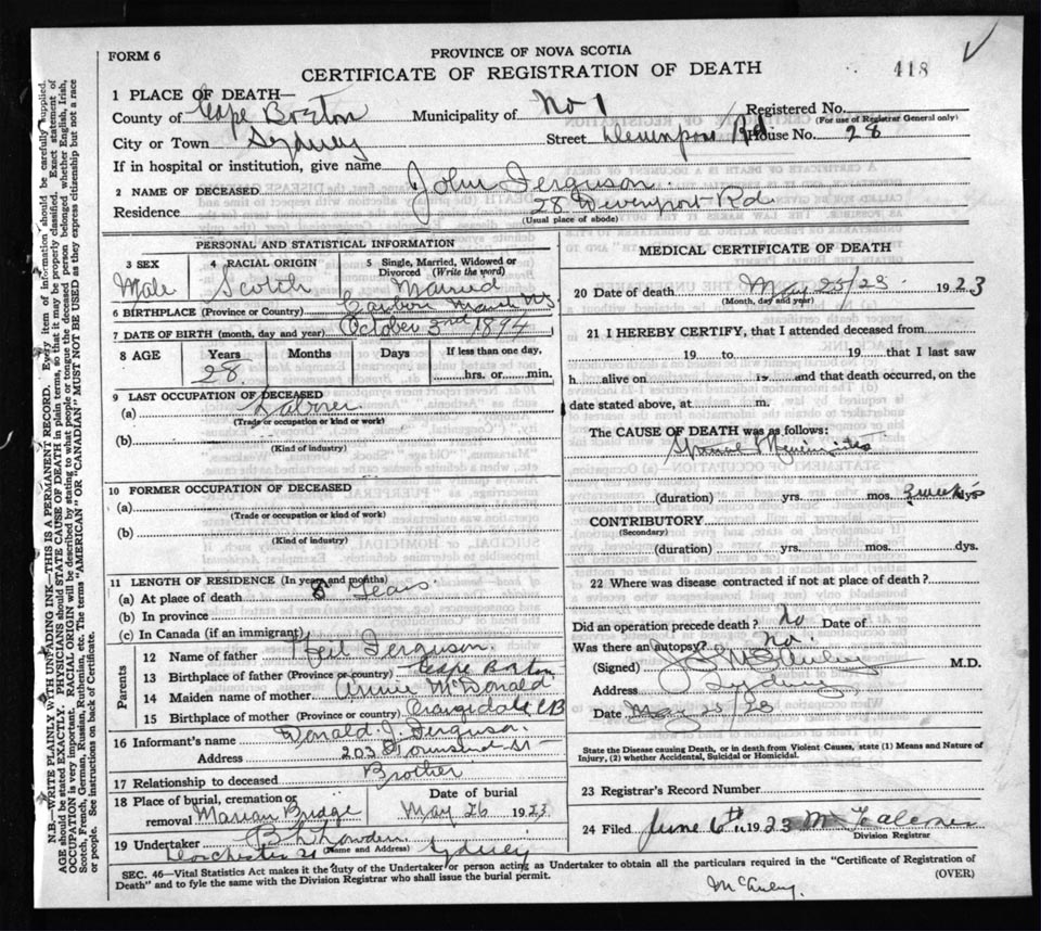 Male Death Registration: Year: 1923 file: 77 number: 418