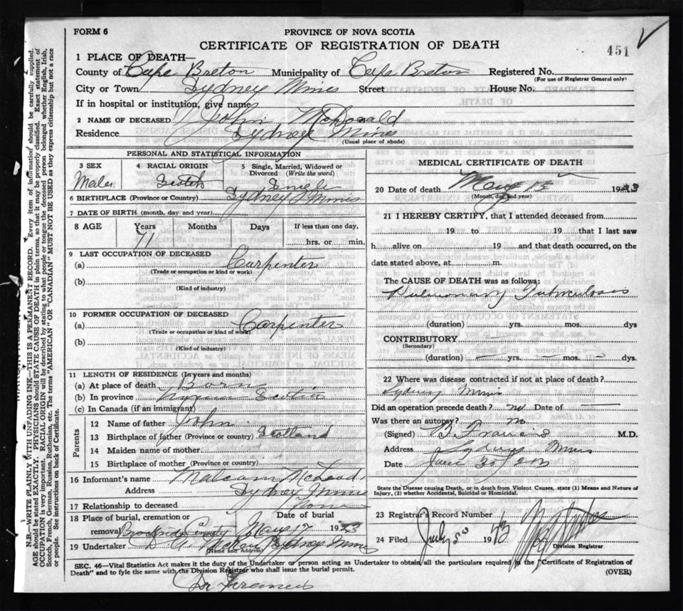 Death Registration: Year: 1923 file: 77 number: 451