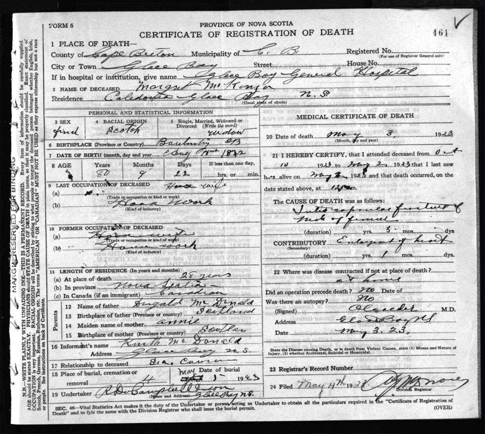 Death Registration: Year: 1923 file: 77 number: 461