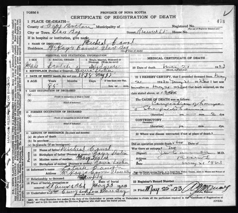 Death Registration: Year: 1923 file: 77 number: 476