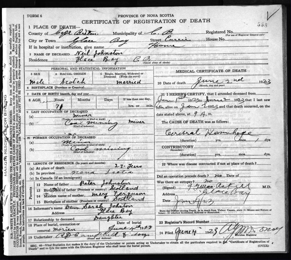 Death Registration: Year: 1923 file: 77 number: 558