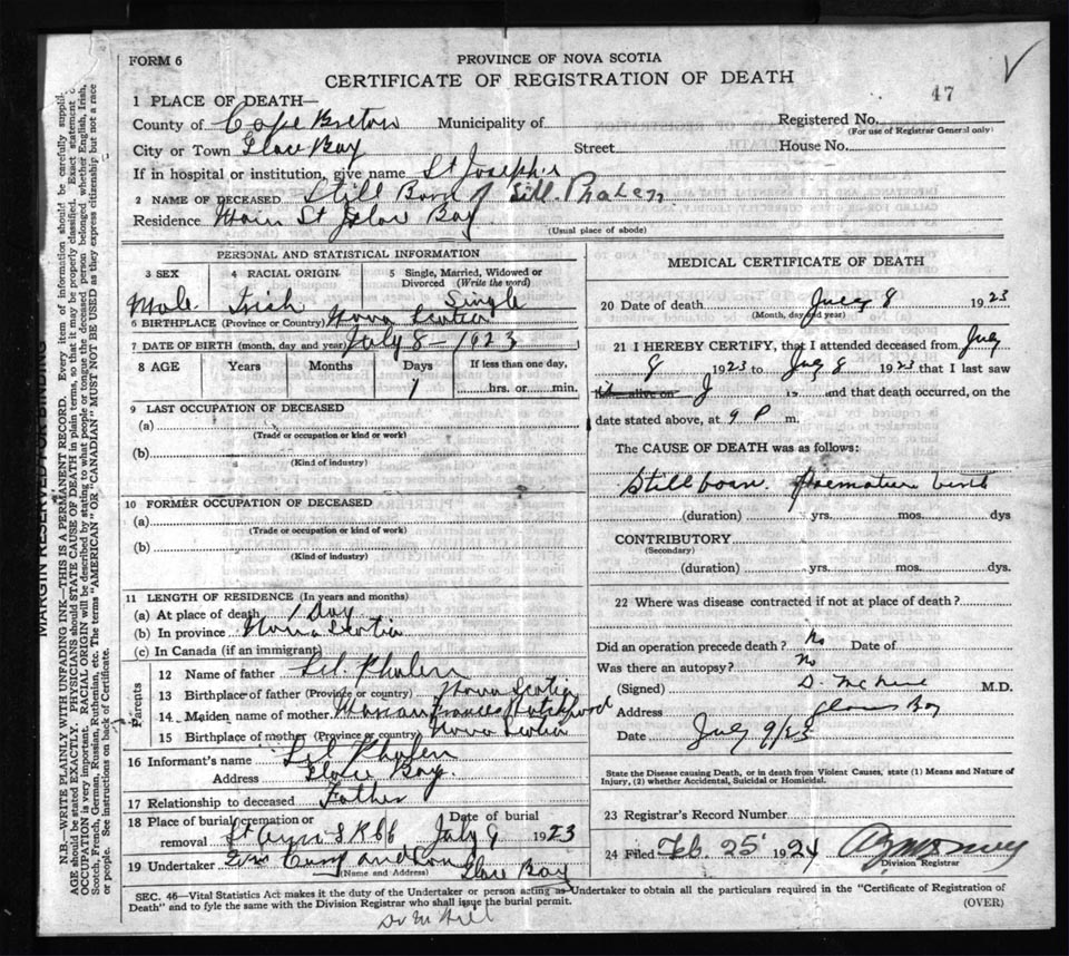 Male Death Registration: Year: 1923 file: 78 number: 47