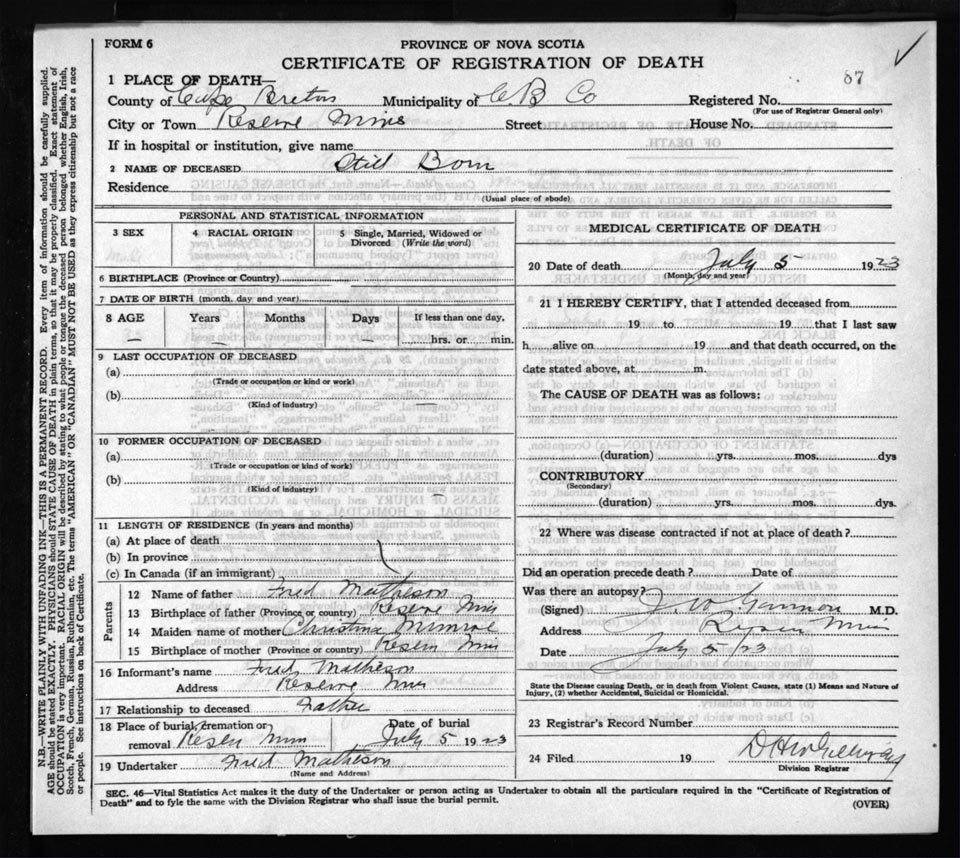 Death Registration: Year: 1923 file: 78 number: 87