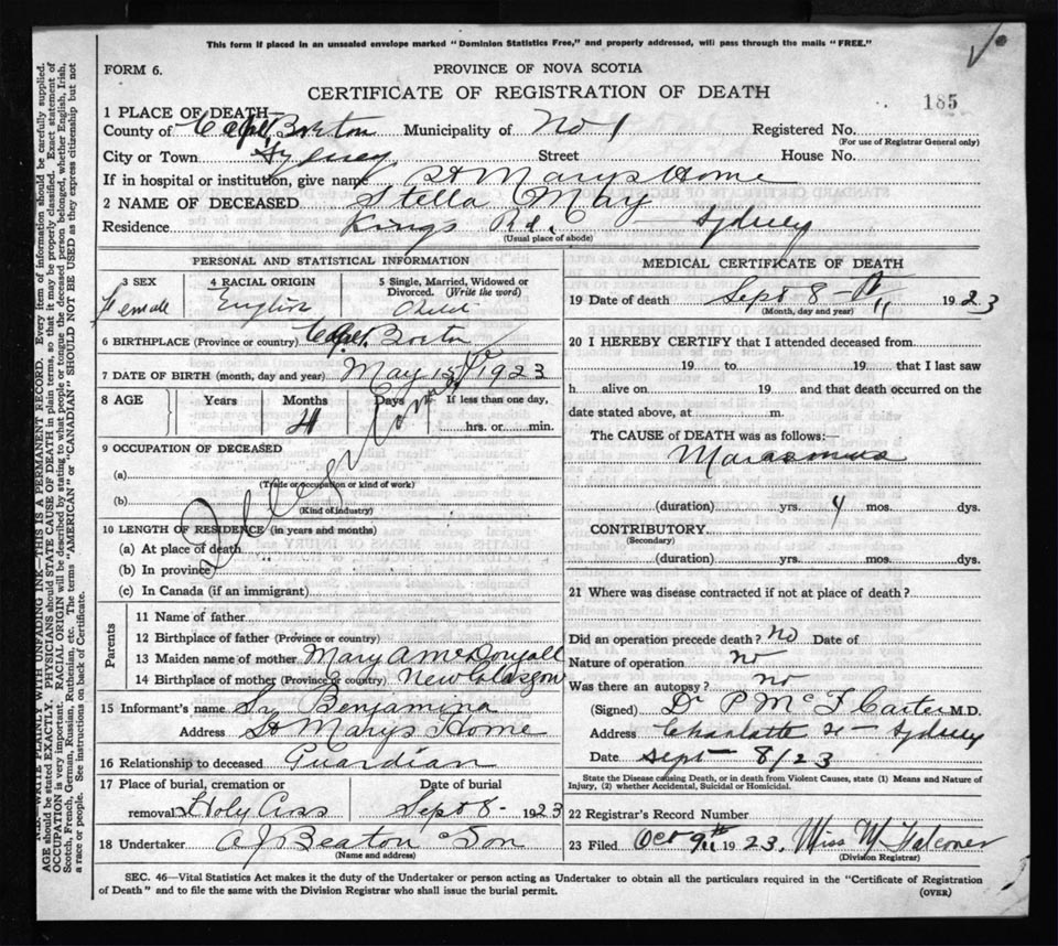 Death Registration: Year: 1923 file: 78 number: 185