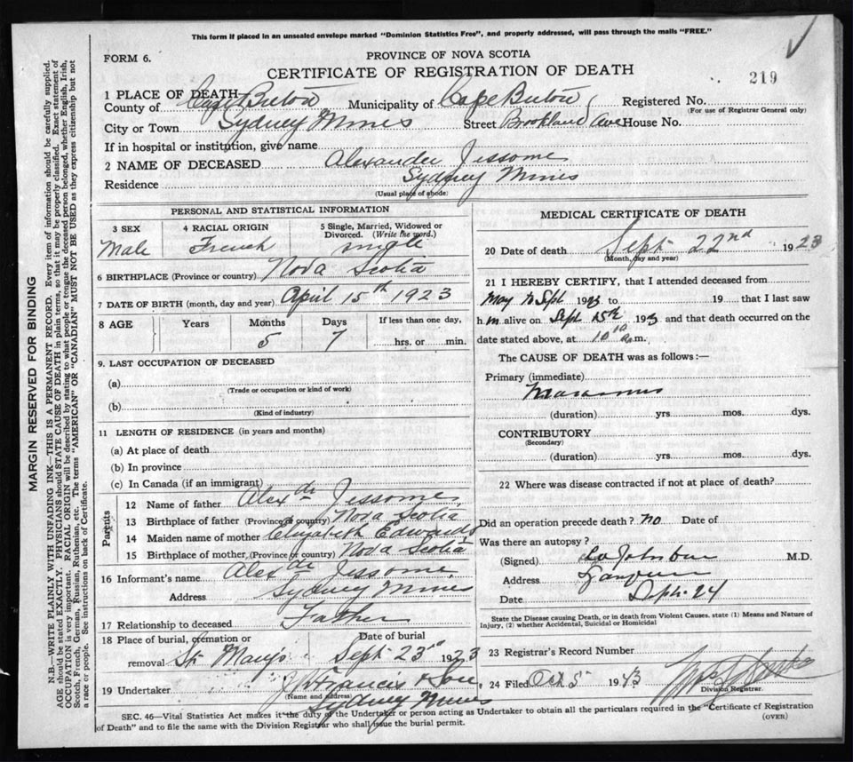 Death Registration: Year: 1923 file: 78 number: 219
