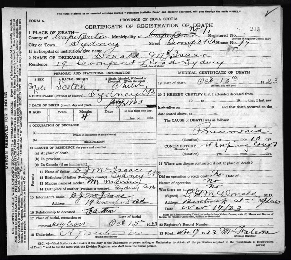 Death Registration: Year: 1923 file: 78 number: 273