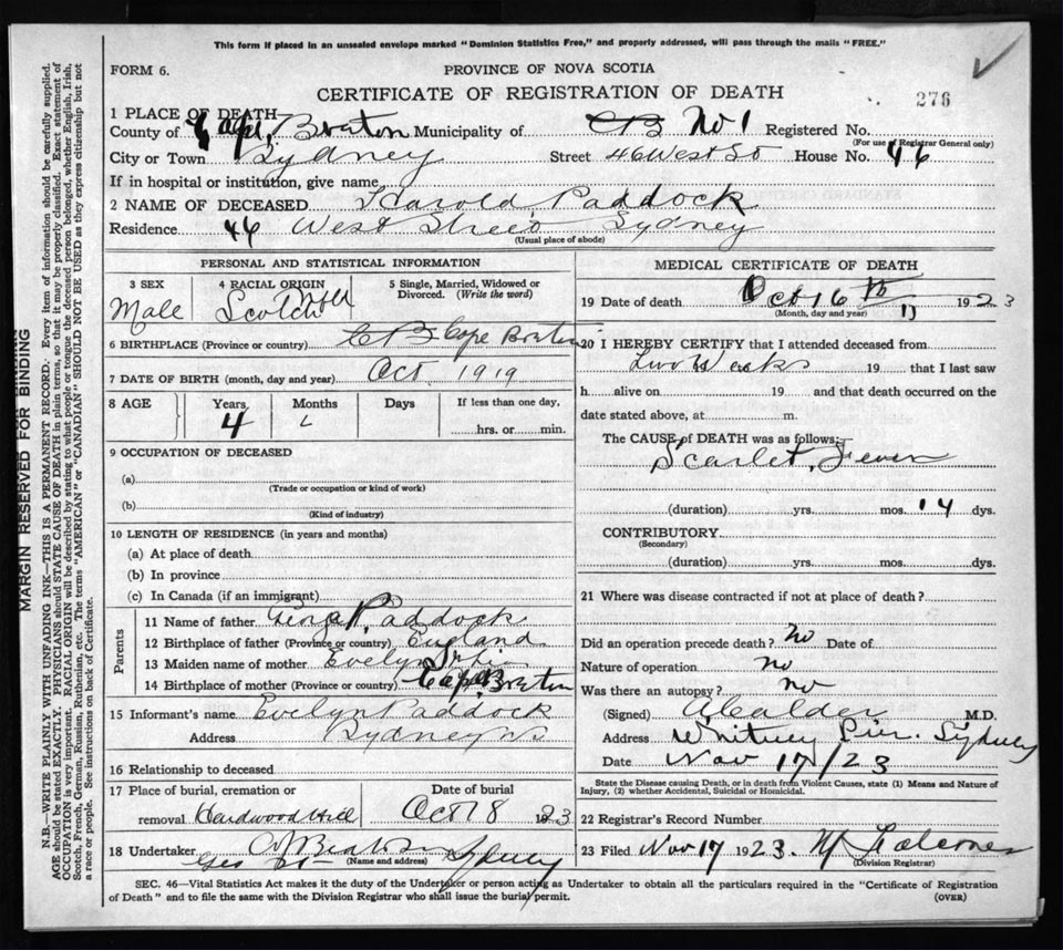 Death Registration: Year: 1923 file: 78 number: 276