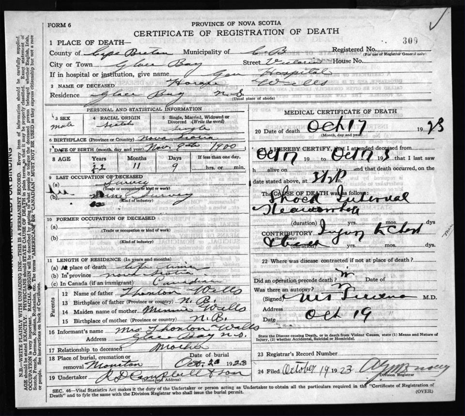 Death Registration: Year: 1923 file: 78 number: 309