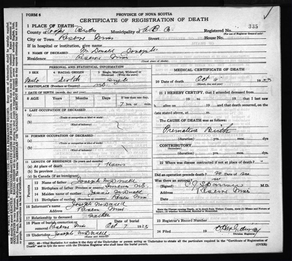 Death Registration: Year: 1923 file: 78 number: 335