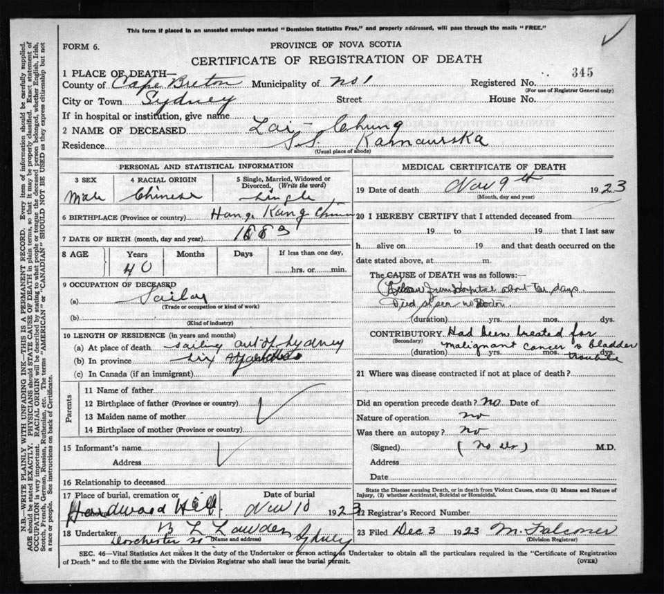Death Registration: Year: 1923 file: 78 number: 345