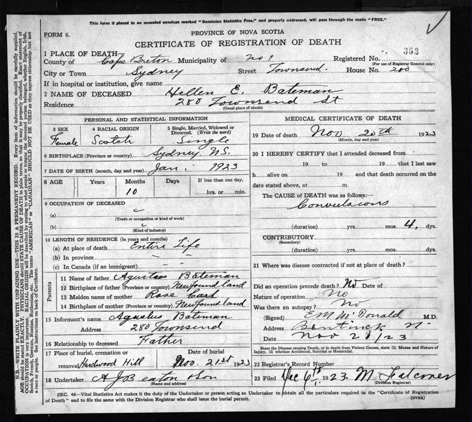 Death Registration: Year: 1923 file: 78 number: 352