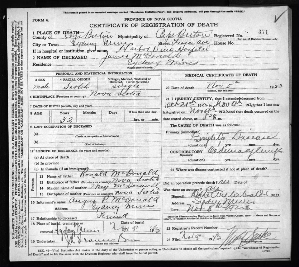 Death Registration: Year: 1923 file: 78 number: 371