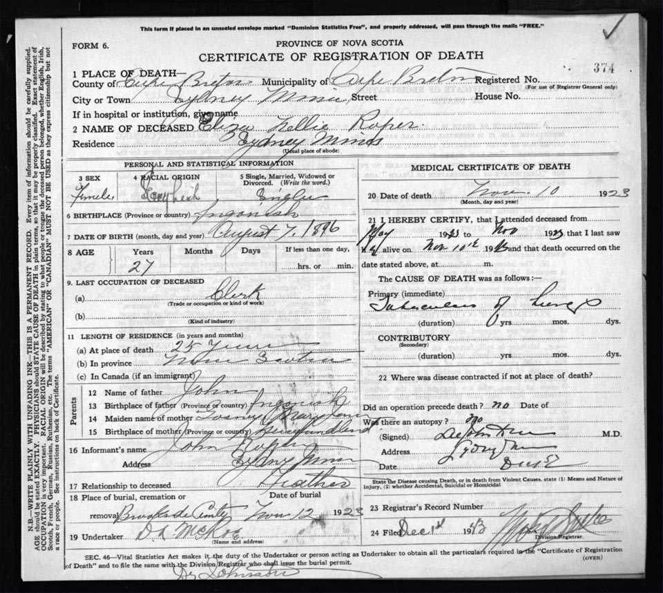 Death Registration: Year: 1923 file: 78 number: 374