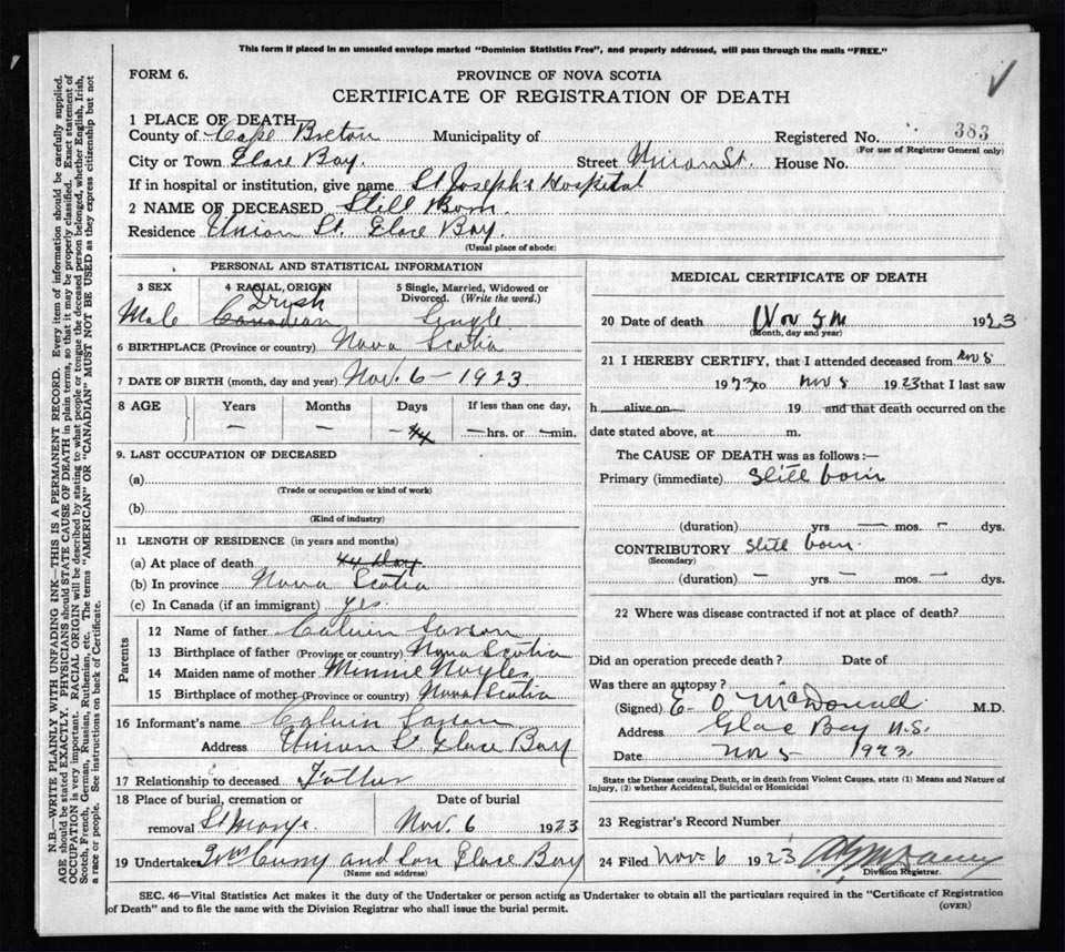 Male Death Registration: Year: 1923 file: 78 number: 383