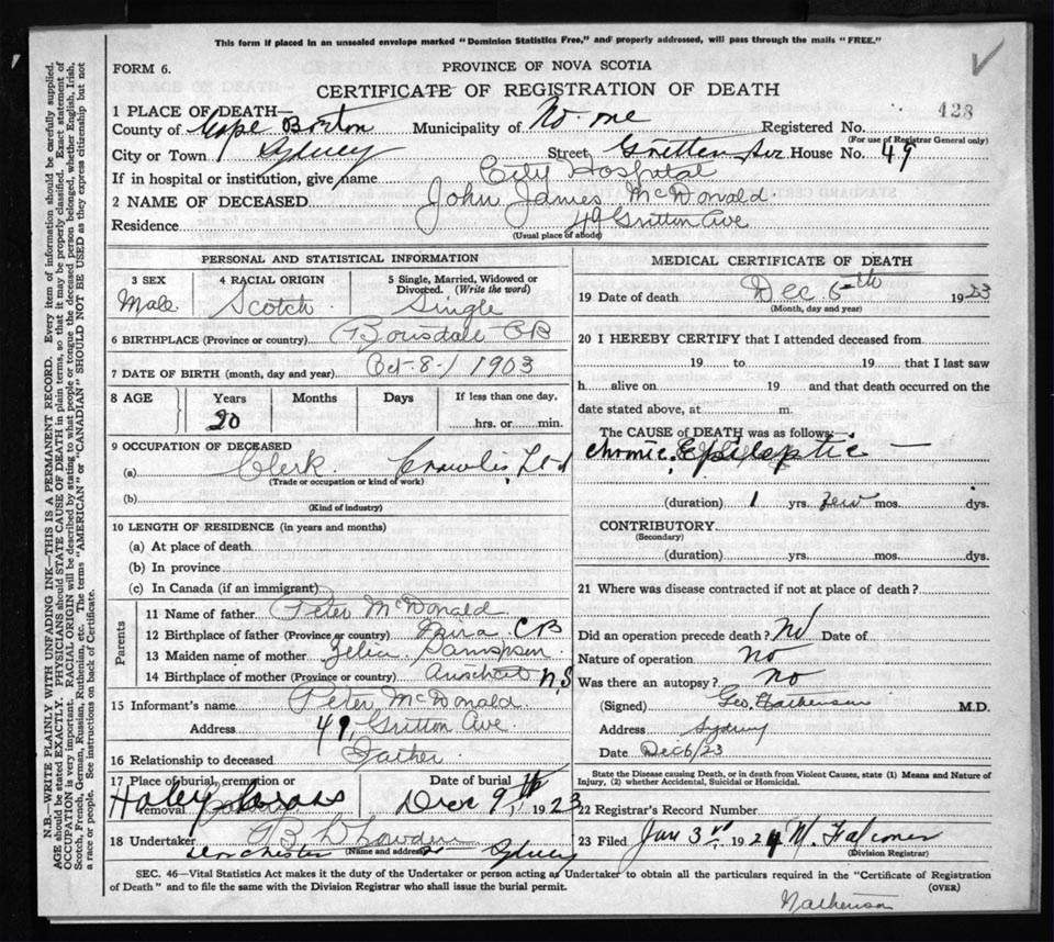 Death Registration: Year: 1923 file: 78 number: 428