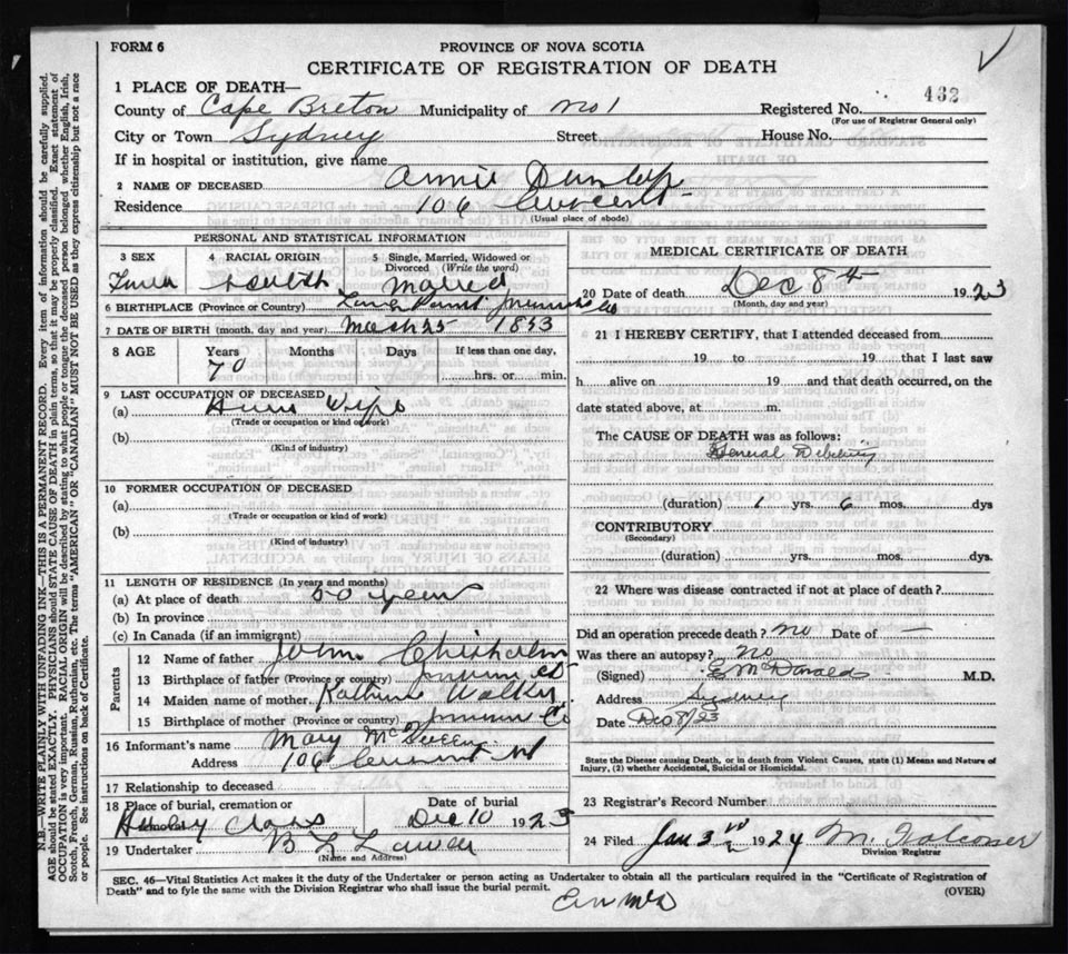 Death Registration: Year: 1923 file: 78 number: 432
