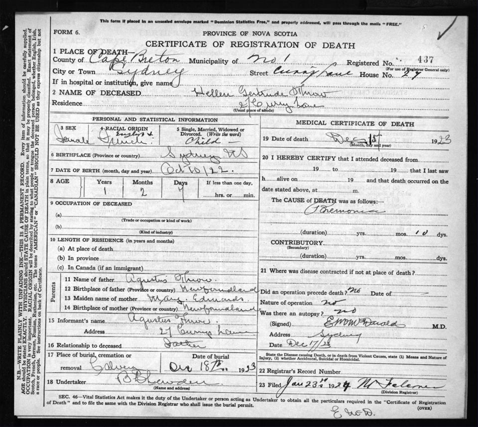 Death Registration: Year: 1923 file: 78 number: 437