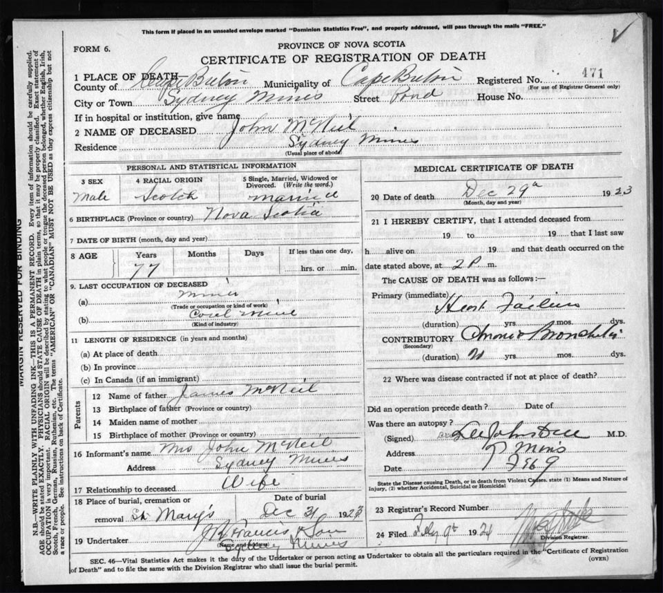 Death Registration: Year: 1923 file: 78 number: 471
