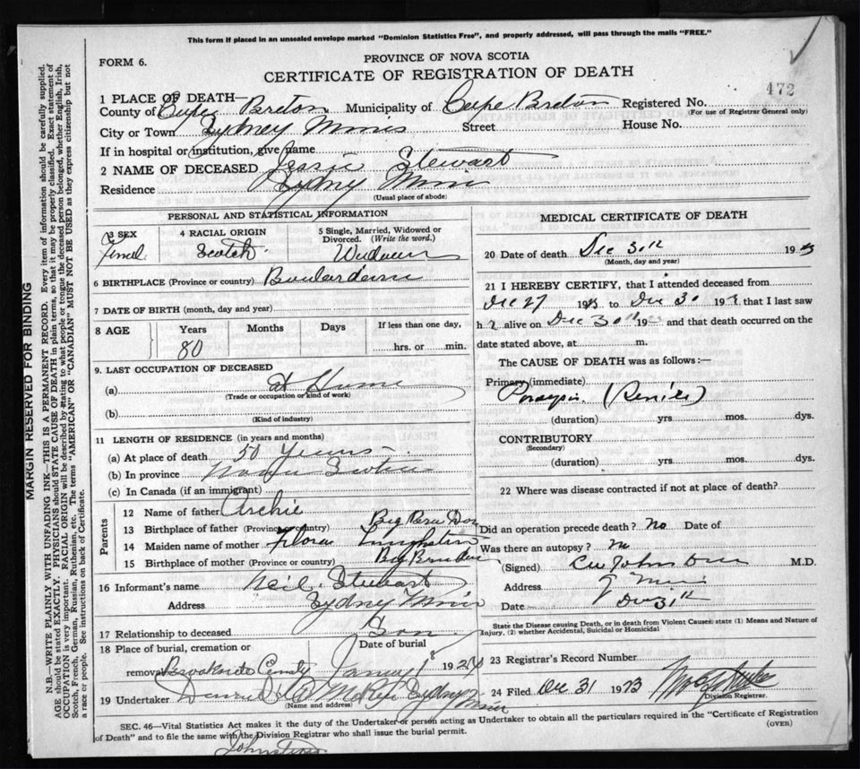 Death Registration: Year: 1923 file: 78 number: 472