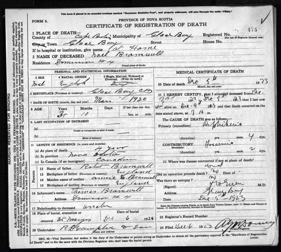 Death Registration: Year: 1923 file: 78 number: 475