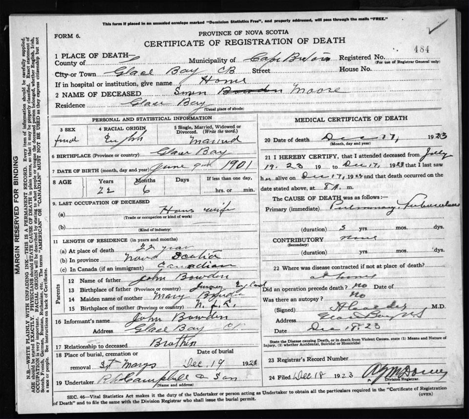 Death Registration: Year: 1923 file: 78 number: 484