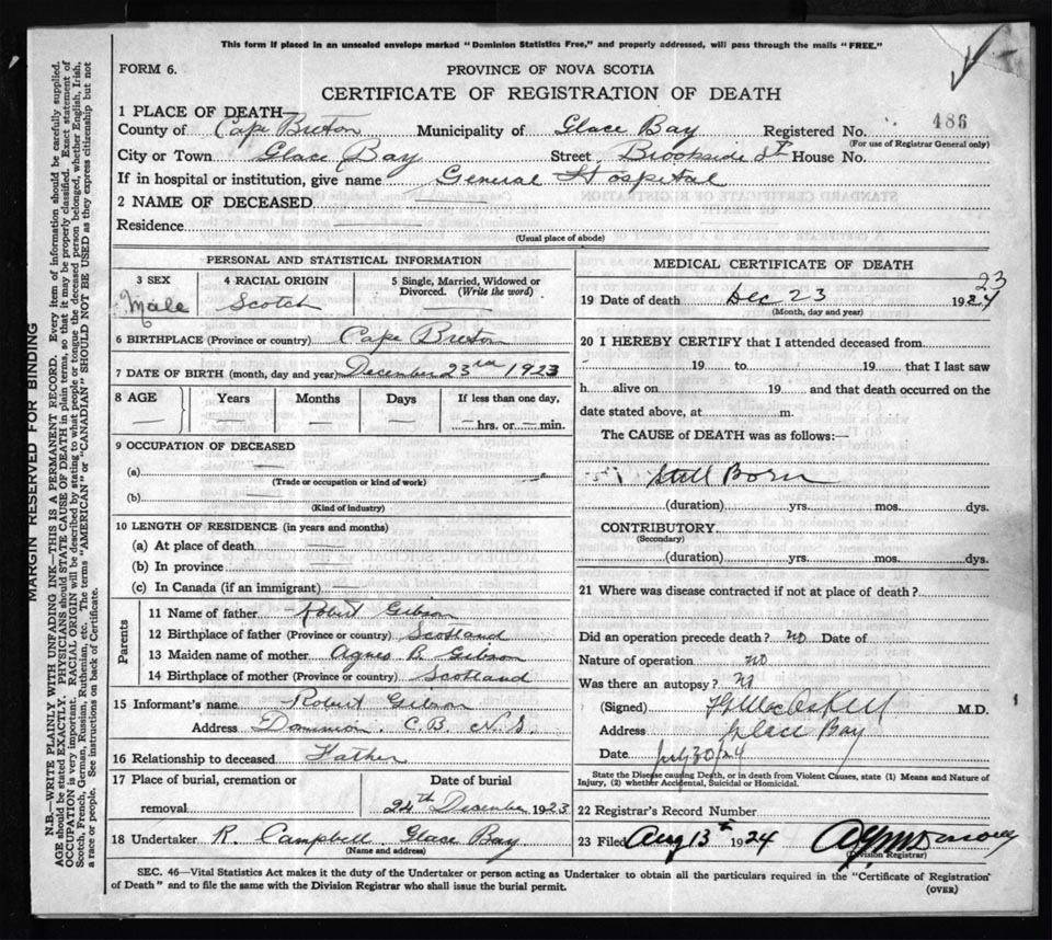 Male Death Registration: Year: 1923 file: 78 number: 486