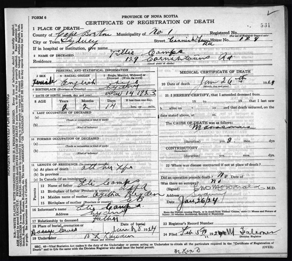 Death Registration: Year: 1924 file: 78 number: 531