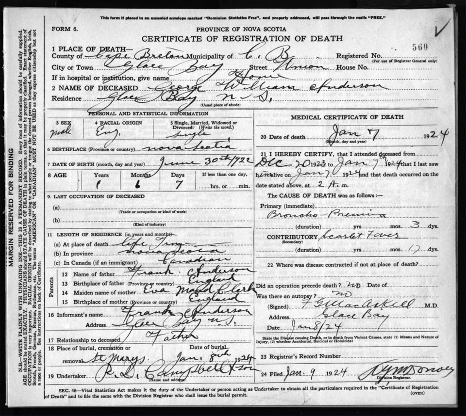 Death Registration: Year: 1924 file: 78 number: 560