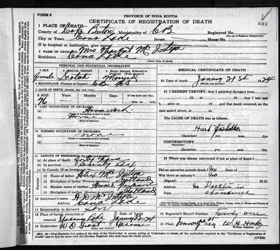 Death Registration: Year: 1924 file: 78 number: 606