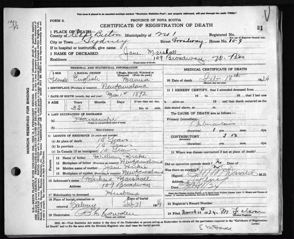 Death Registration: Year: 1924 file: 79 number: 21