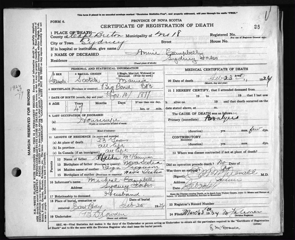 Death Registration: Year: 1924 file: 79 number: 28