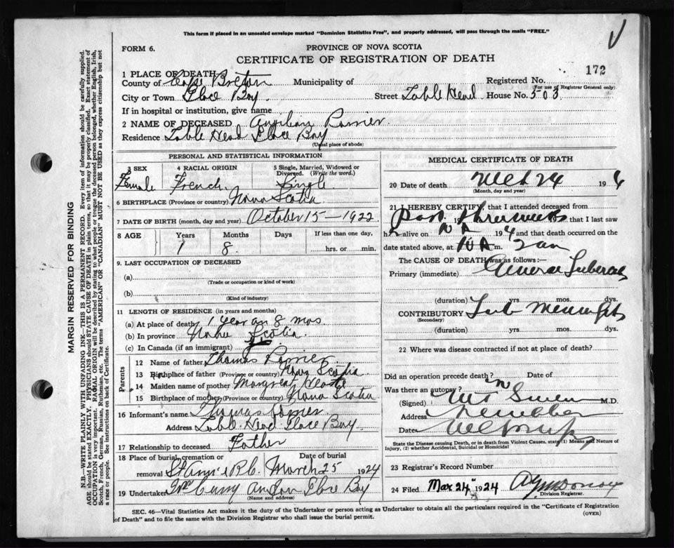 Death Registration: Year: 1924 file: 79 number: 172