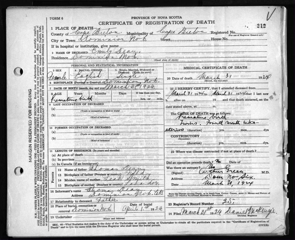 Death Registration: Year: 1924 file: 79 number: 212