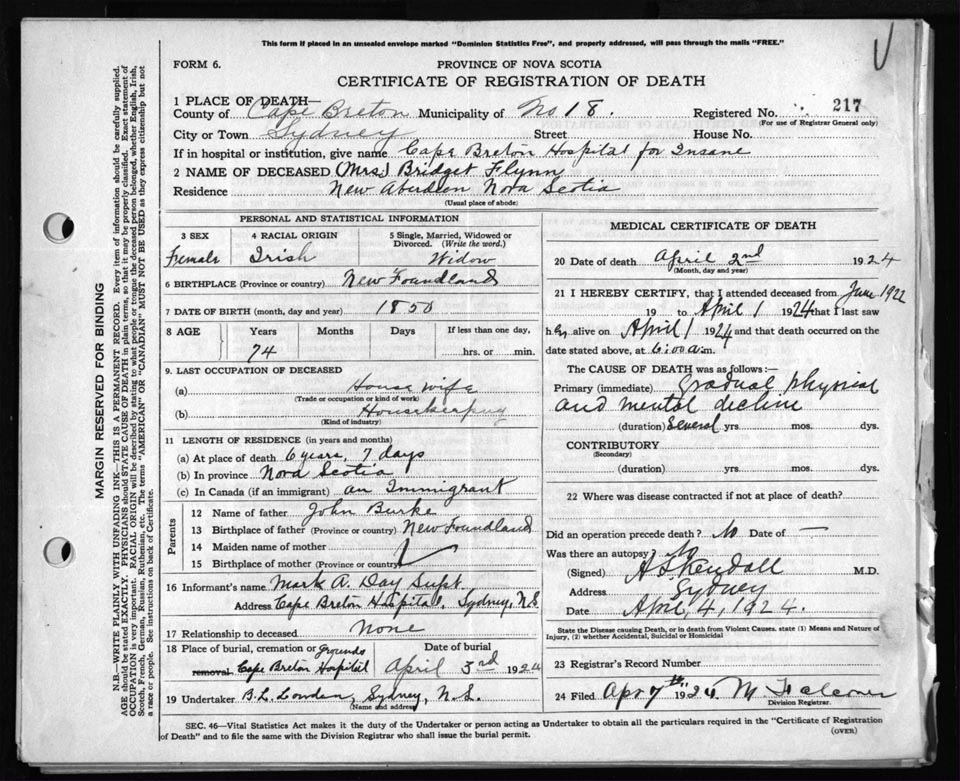 Death Registration: Year: 1924 file: 79 number: 217