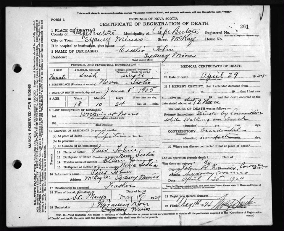 Death Registration: Year: 1924 file: 79 number: 261