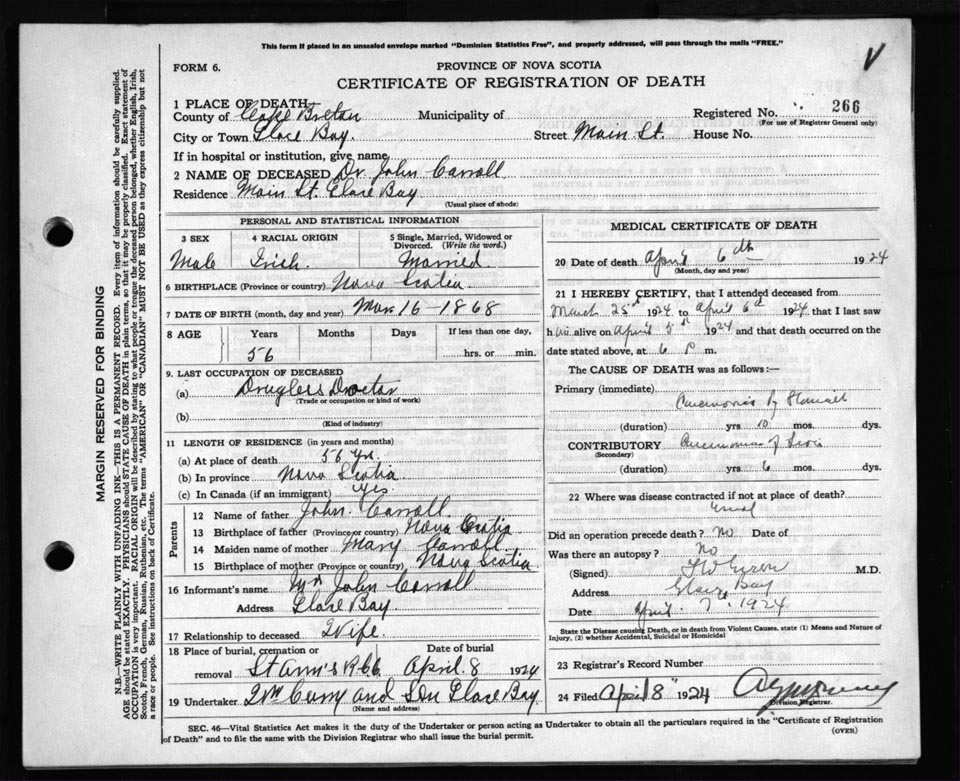 Death Registration: Year: 1924 file: 79 number: 266